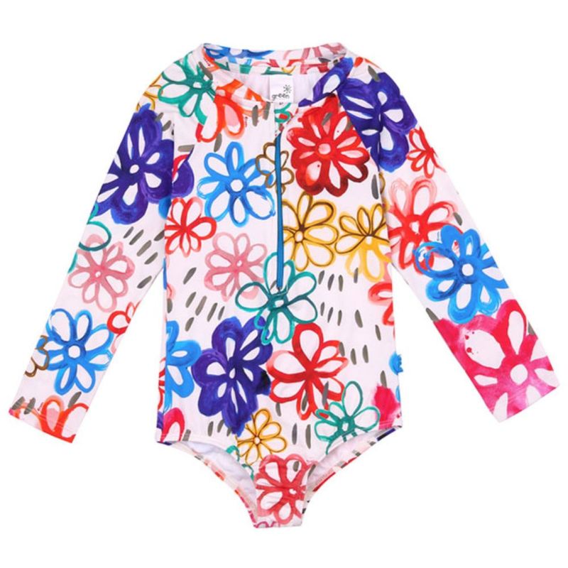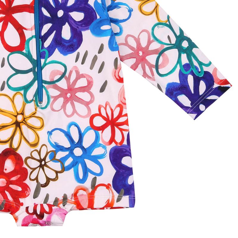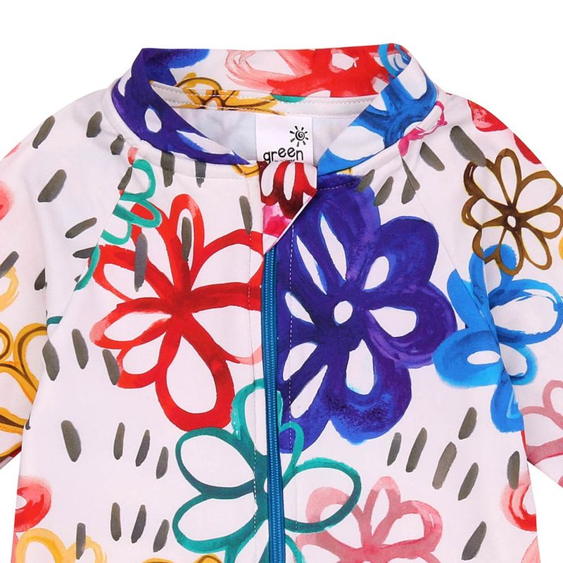 Encante-se com nosso macacão de praia ART FLOWER! Multicolorido, suas flores parecem saídas de um desenho infantil. Confeccionado em 90% poliamida e 10% elastano SOLARE II ESTAMPADO, oferece proteção UV 50+ e um tecido superleve. Com mangas compridas, possui abertura frontal por zíper e nos entrepernas, proporcionando praticidade na troca do bebê. Moda praia com conforto e estilo para as pequenas.